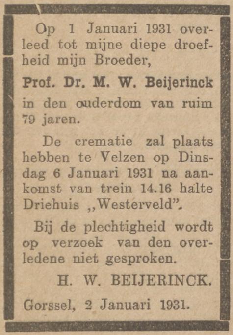 [16] Voor de overlijdensakte van Martinus Willem Beijerinck, zie Gelders Archief te Arnhem, archief 0207A, inv.nr. 9741.05, 27-12-1937, Gorssel, Overlijdensregister, aktenr. 90 [Gelders Archief] en Gelders Archief te Arnhem, archief 0207A, inv.nr. 8358.09, 02-01-1931, Gorssel, Overlijdensregister, aktenr. 2 [Gelders Archief]. Bij zijn overlijden maakt Martinus een villa met boshuis en dennenbos ter grootte van 4,5 hectare na aan de vereniging ‘Volksonderwijs’ in Amsterdam volgens Nieuwe Hoornsche courant (23 april 1931). p. 5 [Delpher]. Zie ook Het katholieke schoolblad voorheen De katholieke onderwijzer, officieel weekblad voor het bijzonder onderwijs-eigendom der St. Lebuïnus-Vereeniging in het Aartsbisdom en der Diocesaan-Vereeniging in het Bisdom Haarlem 29, nr. 1431 (1931), p. 355 [Delpher].