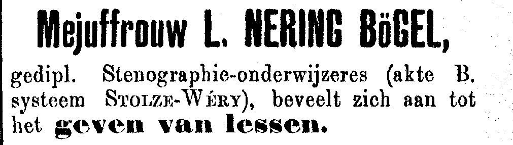 Ondertussen haalt Nering Bögel ook nog diploma A “voor de zuivere toepassing van het correspondentieschrift en vertrouwdheid met het systeem Stolze-Wéry” volgens bericht in PGNC (19 juli 1896). In november 1896 haalt ze bovendien diploma B tot het geven van onderwijs in stenografie volgens het systeem Stolze-Wéry volgens PGNC (15 november 1896).