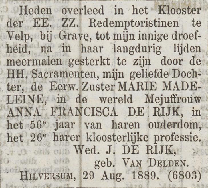 In 1889 sterft Anna de Rijk, “van beroep: Religieuse”. [14] Uit de overlijdensadvertentie die haar moeder vervolgens in de krant laat plaatsen, blijkt dat het overlijden niet onverwacht is. Er wordt immers gesproken van “langdurig lijden” en het “meermalen” toepassen van de sacramenten.