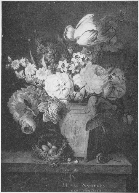 Het enige, nog bewaard gebleven werk van Johanna Ida van Stolk, die in december 1803 trouwt met Dionys van Nijmegen[5], is een kopie naar een stilleven van de Rotterdamse schilder Willem van Leen. Ter onderscheid signeert Van Stolk haar versie met ‘J.I. van Nijmegen geboren van Stolk’. Daar zij signeert met haar getrouwde naam, moet het werk wel na 1803 zijn gemaakt.
