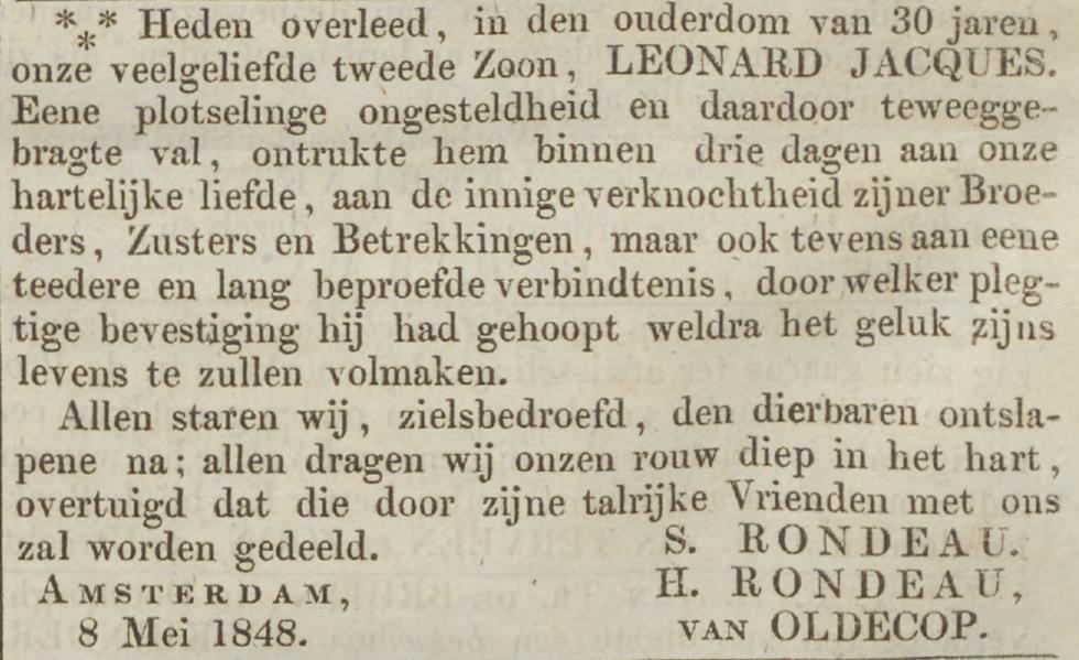 Hij sterft binnen drie dagen. In de advertentie suggereert de familie bovendien dat Leonard Jacques op het punt stond om een huwelijksverbintenis aan te gaan, als er wordt gehint op een “teedere en lang beproefde verbindtenis, door welker plegtige bevestiging hij had gehoopt weldra het geluk zijns levens te zullen volmaken.” De geplande voltrekking van deze verbintenis zou dus nooit plaatsvinden.